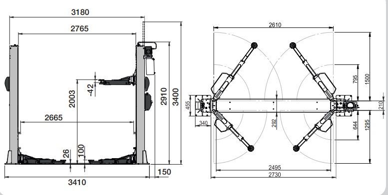 Elevadores electrohidráulicos de 2 columnas con base de conexión a tierra para techos de altura limitada.