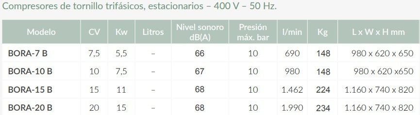 Fruto de la constante investigación de nuestro departamento técnico, la serie BORA propone unos compresores de tornillo de alta calidad a un precio muy competitivo. Integramente diseñados y fabricados en la CE, con la misma tecnología y materiales de calidad que